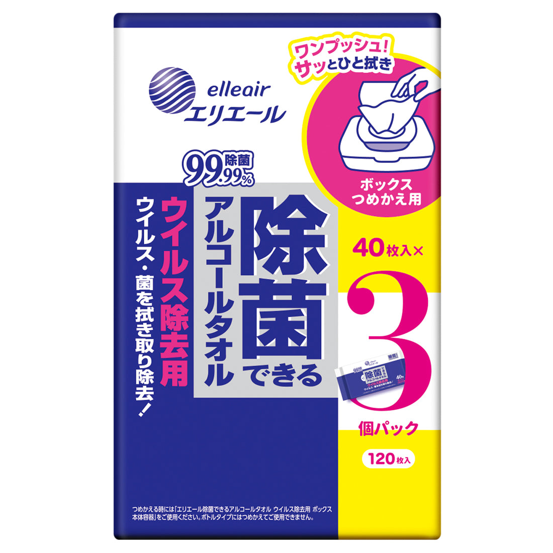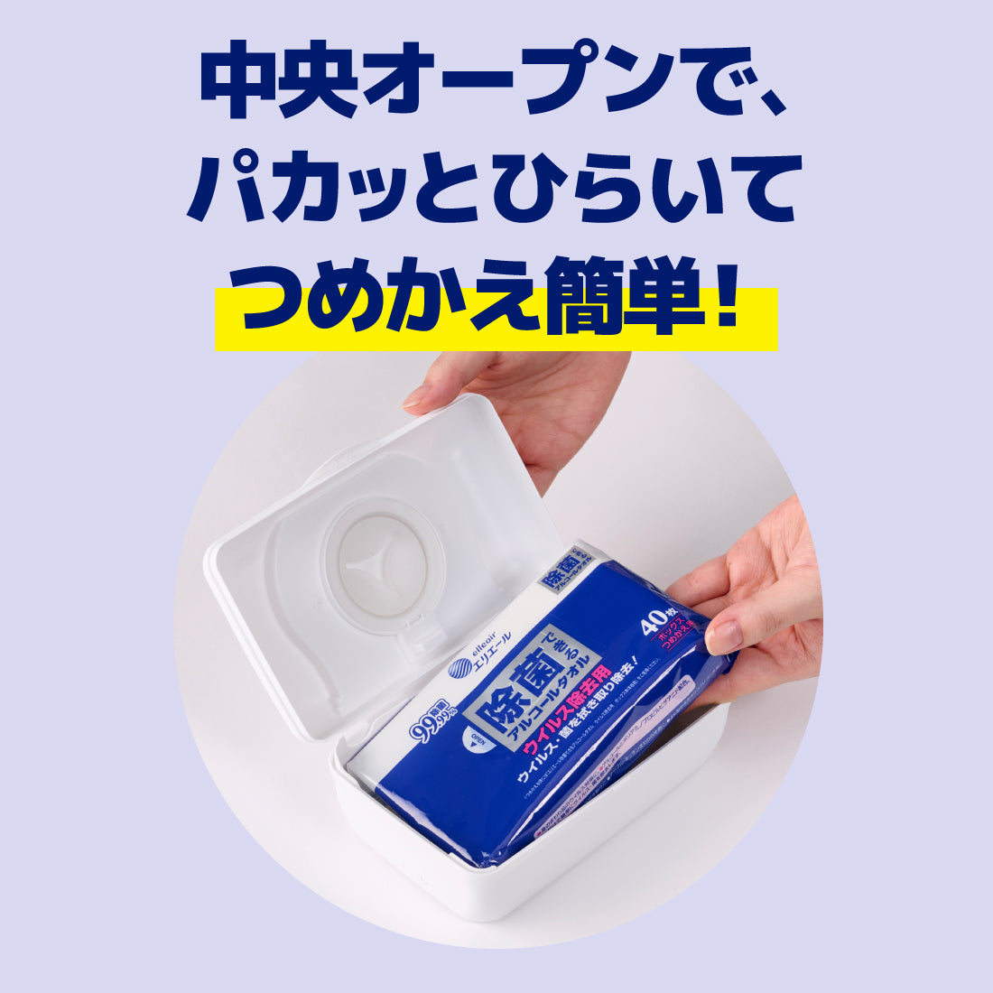 こちらの商品は「除菌できるアルコールタオル ウイルス除去用・ボックスタイプ」の本体詰め替え用商品です。専用の本体はよりシンプルなシルエットに仕上げました。お部屋のインテリアを邪魔することなく、様々な場所になじむデザインです。