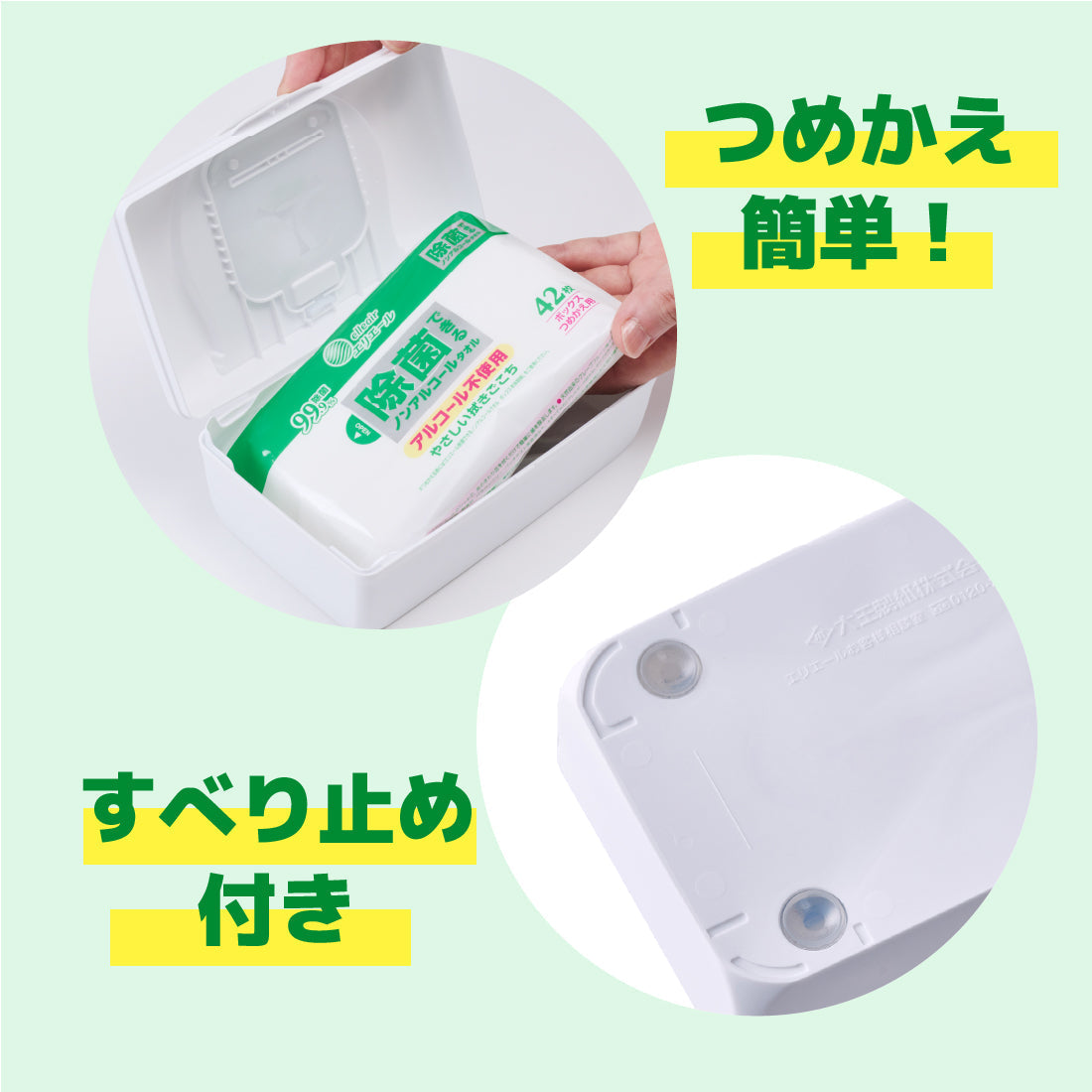 こちらの商品は「除菌できるノンアルコールタオル ボックスタイプ」の本体詰め替え用商品です。専用の本体はよりシンプルなシルエットに仕上げました。お部屋のインテリアを邪魔することなく、様々な場所になじむデザインです。